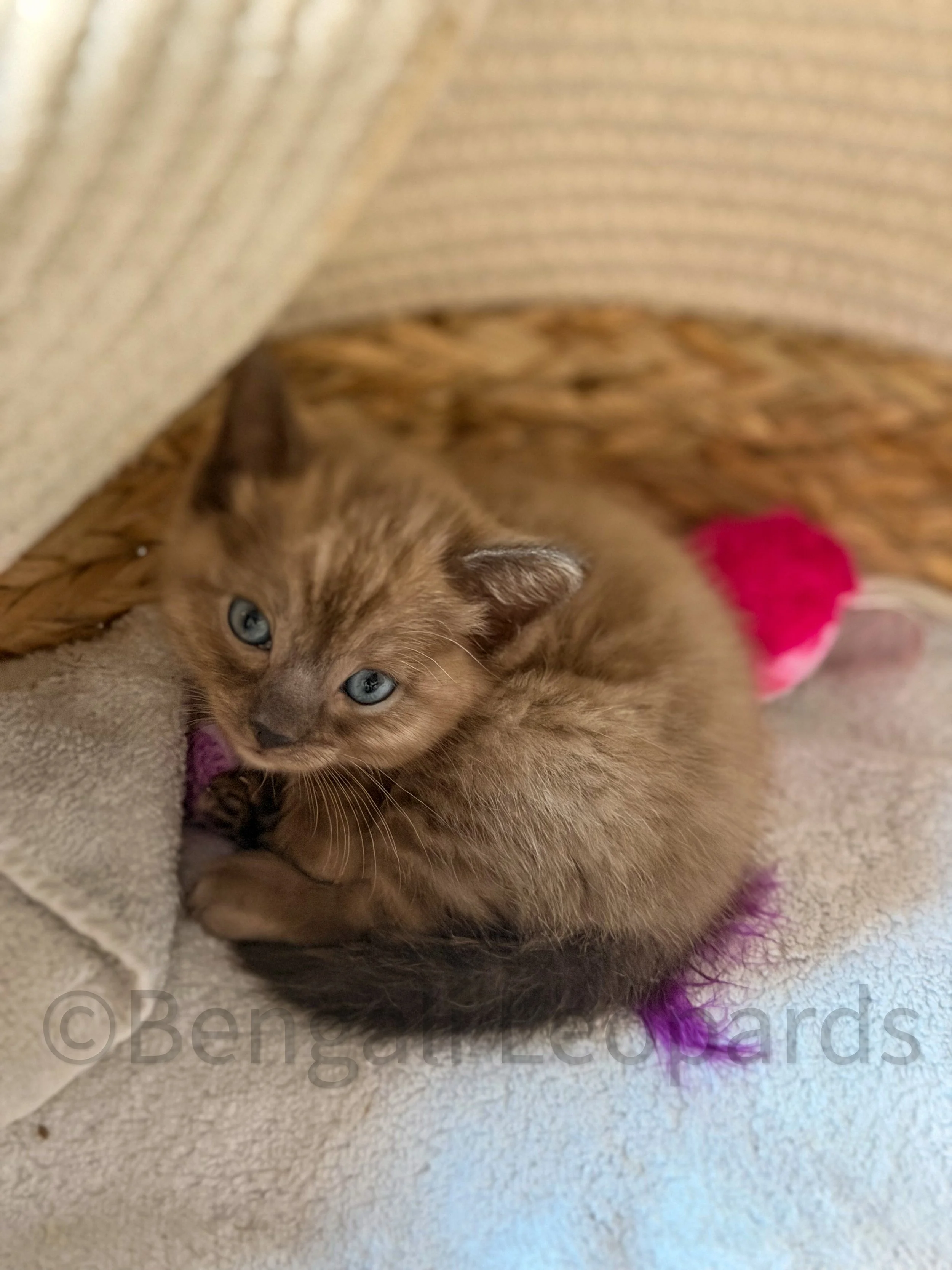 Lumi is our Snow melanistic Mink Bengal, named for her soft glow and gentle presence. She is being raised in our home with close family care, love, and intention as she grows.